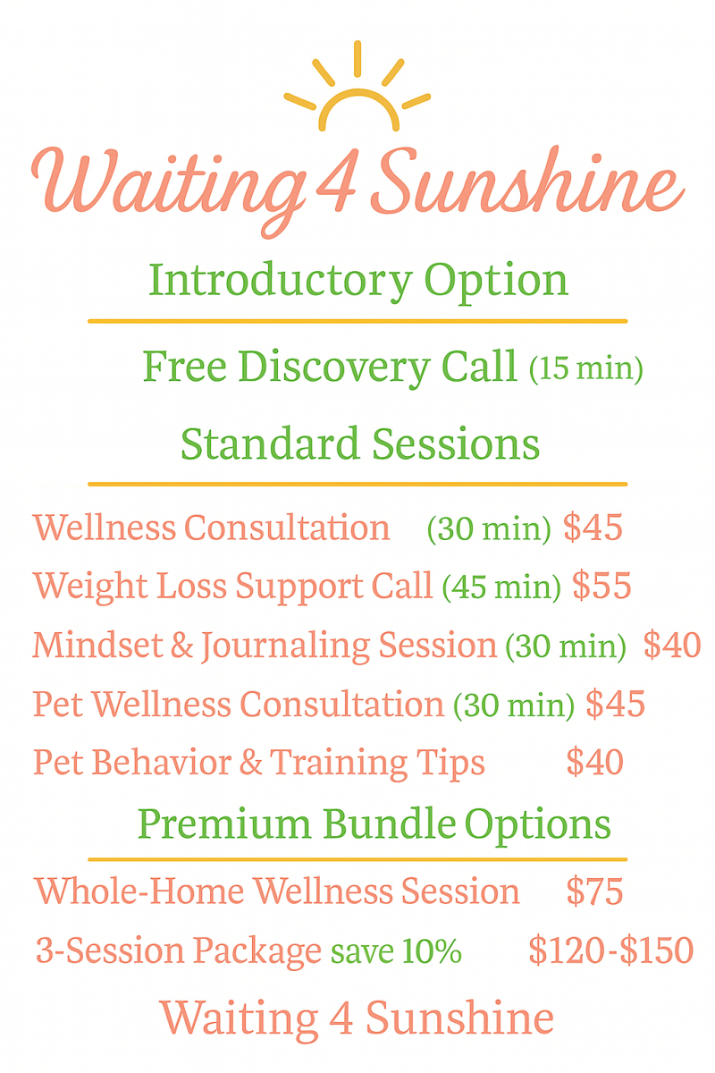 At Waiting 4 Sunshine, we make it easy for you to schedule the services you need. Whether itโs personalized wellness coaching, pet nutrition consultations, or access to exclusive events, we offer a seamless booking experience to help you get started.